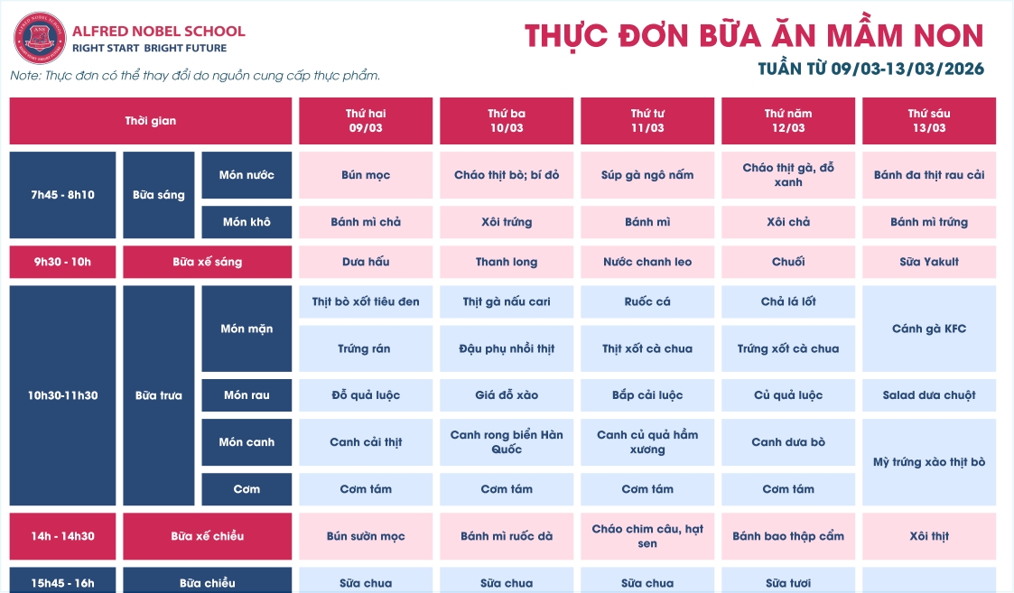 Thực đơn Mầm non tháng 3/2026