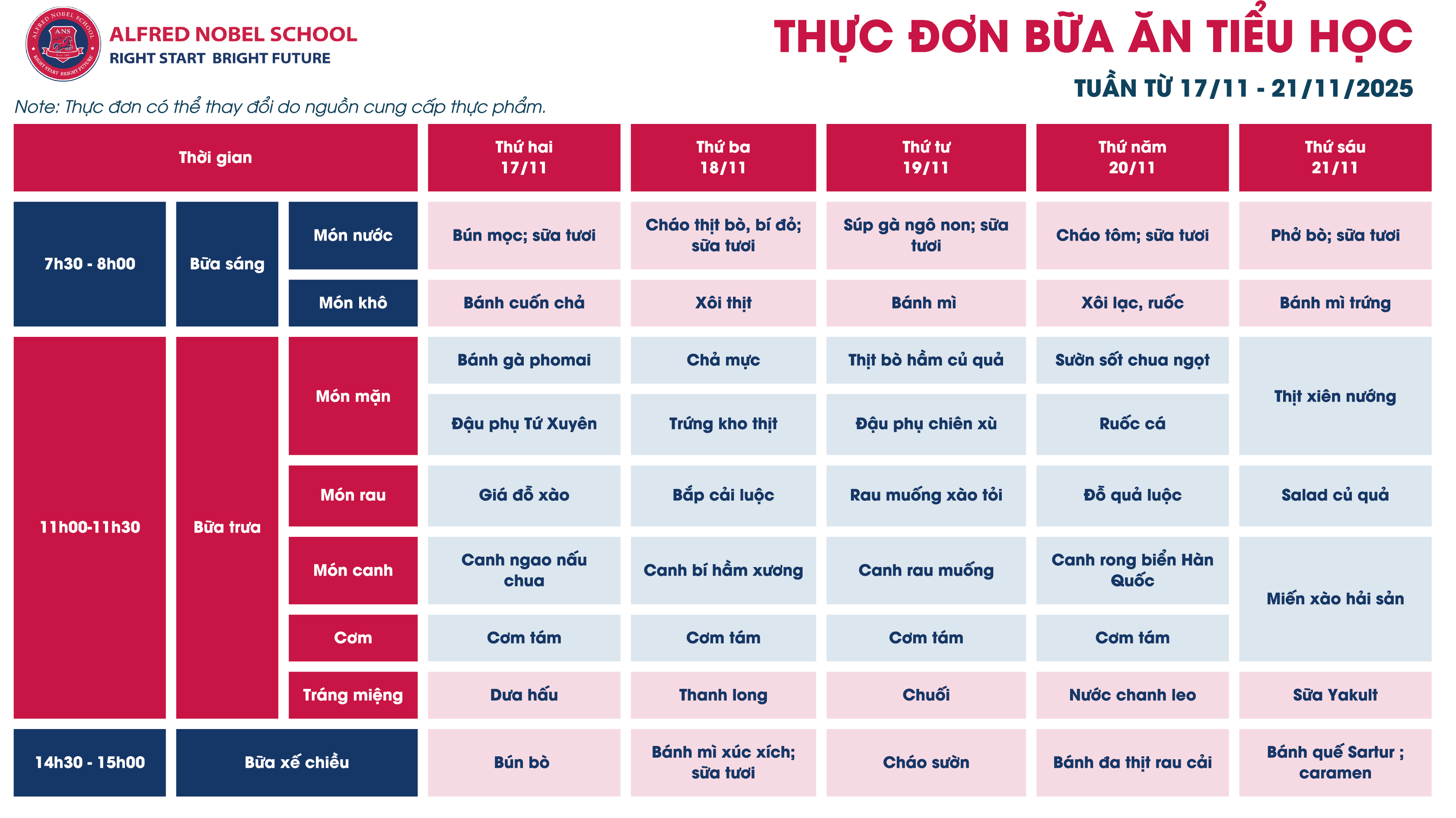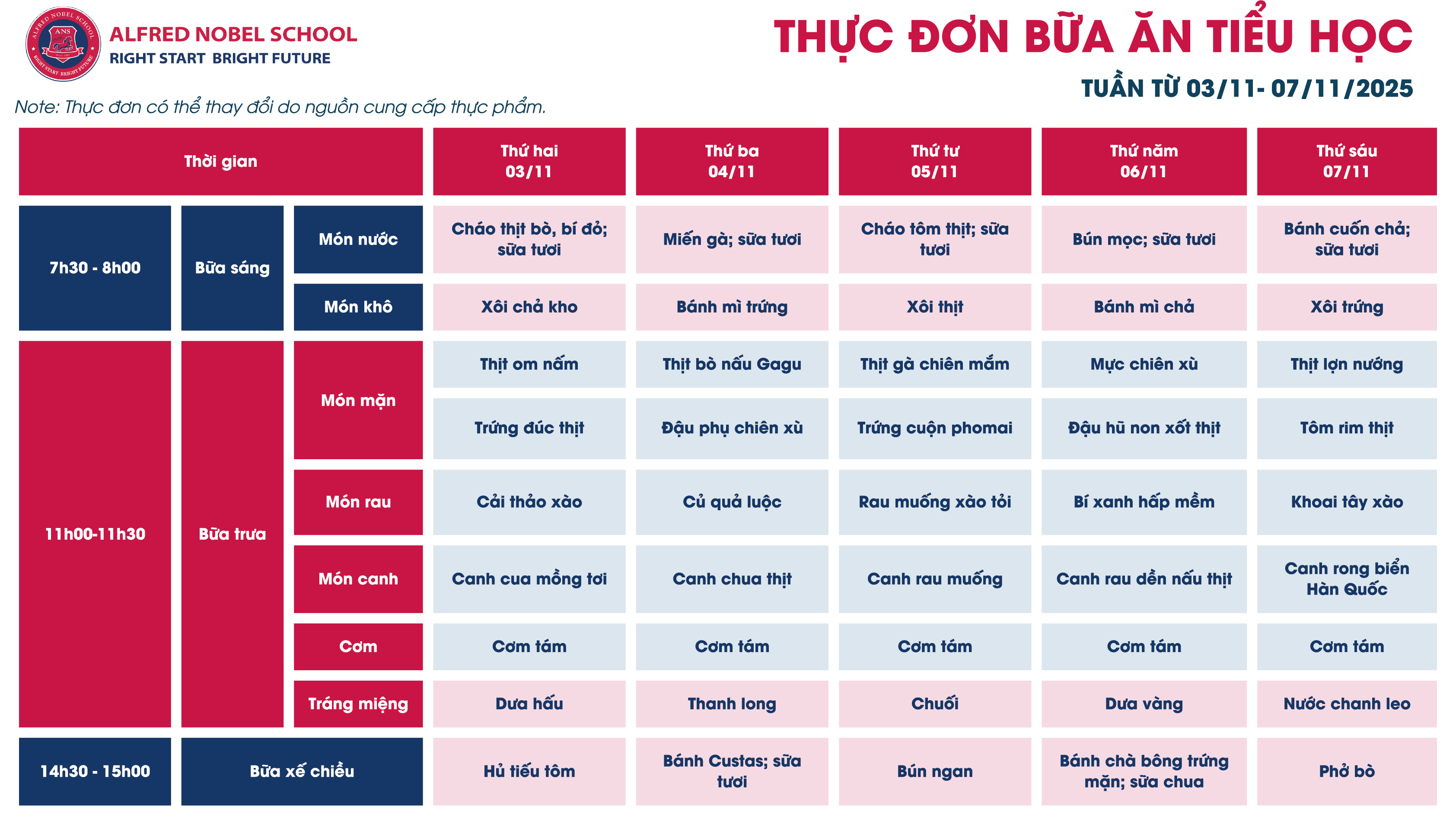 Thực đơn Tiểu học tháng 11/2025