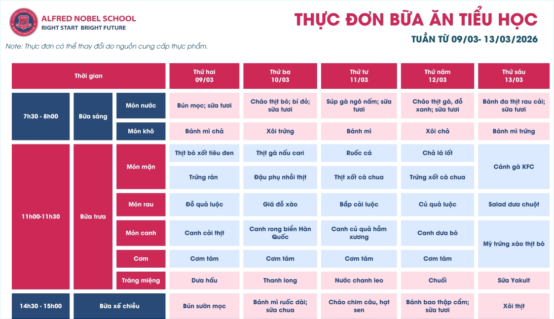 Thực đơn Tiểu học tháng 3/2026