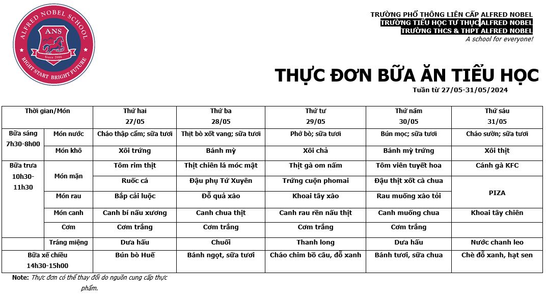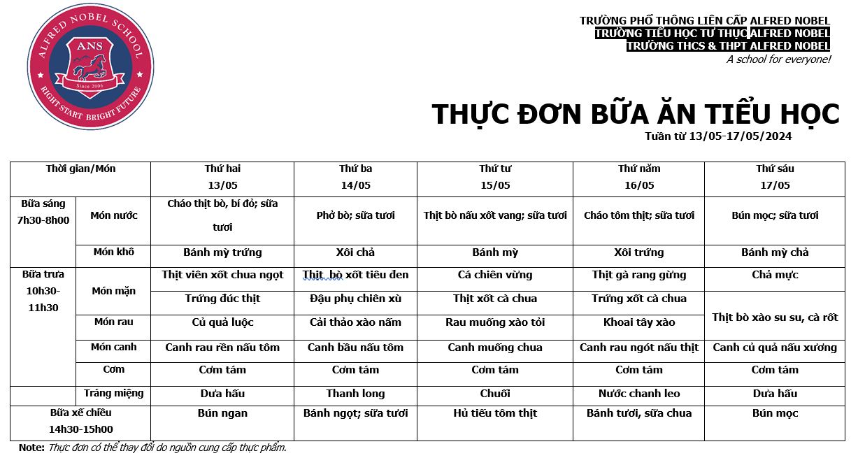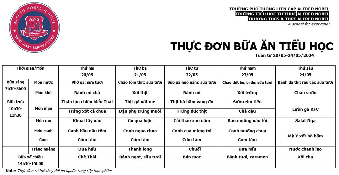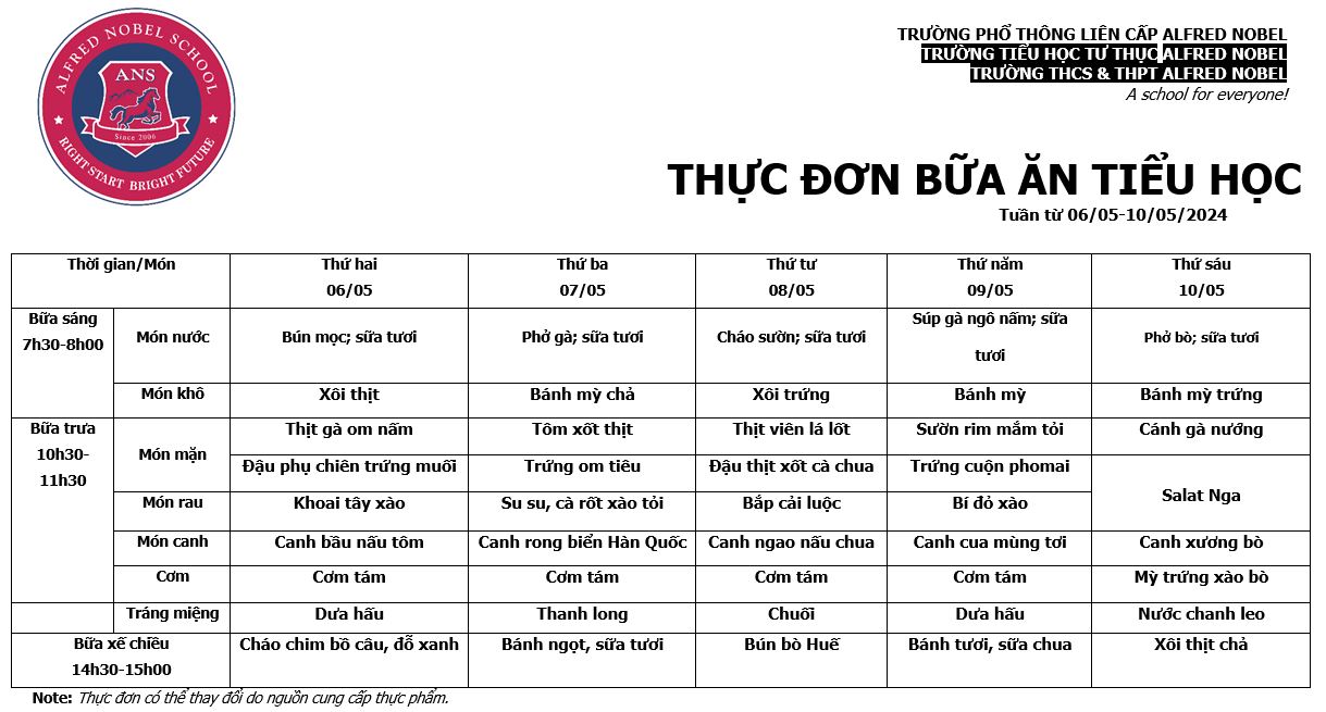Thực đơn Tiểu học tháng 5/2024
