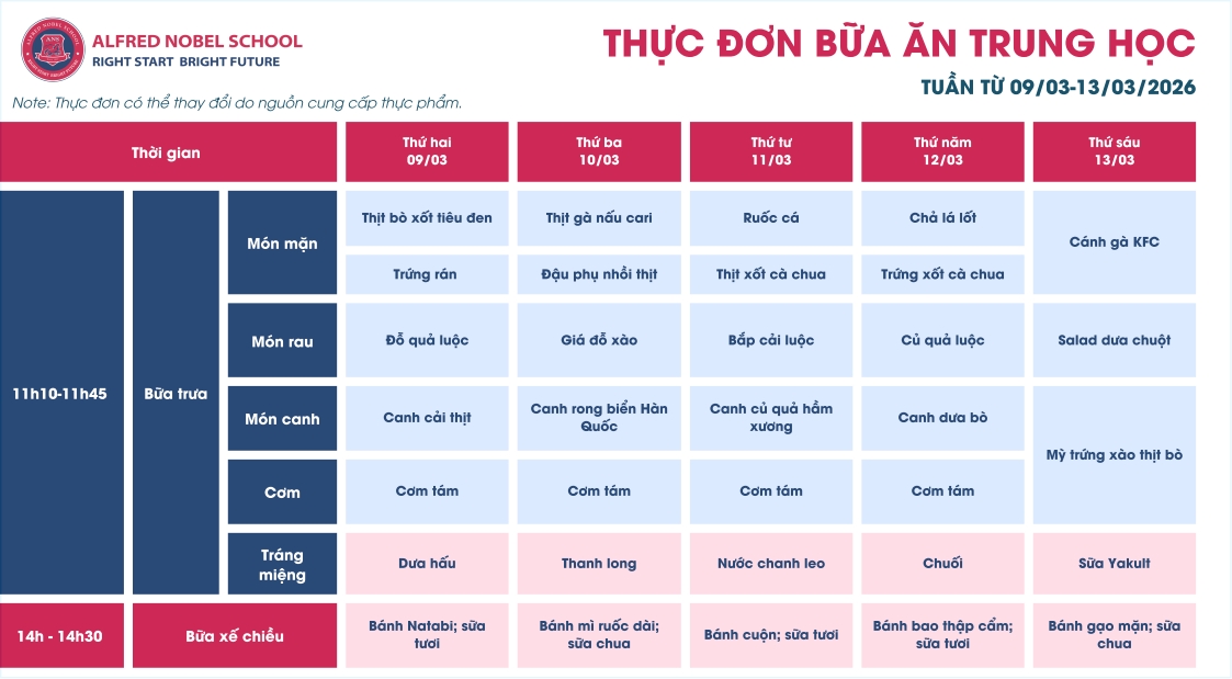 Thực đơn Trung học tháng 3/2026